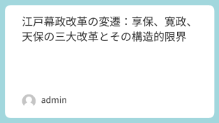 歴史 江戸幕政改革の変遷:享保、寛政、天保の三大改革とその構造的限界 江戸幕政改革の変遷:享保、寛政、天保の三大改革とその構造的限界はじめに:江戸幕政改革の歴史的位置づけ本報告書は、江戸時代に断行された三大改革、すなわち享保の改革、寛政の改革、天保の改革について、その背景、目的、主要政策、結果、および歴史的評... 歴史
