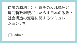 歴史 逆説の勝利:足利尊氏の反乱鎮圧と建武新政継続がもたらす日本の政治・社会構造の変容に関するシミュレーション分析 逆説の勝利:足利尊氏の反乱鎮圧と建武新政継続がもたらす日本の政治・社会構造の変容に関するシミュレーション分析序章:建武の新政の構造的脆弱性とシミュレーションの前提1.1 歴史的背景:鎌倉幕府崩壊と後醍醐天皇の理想1333年、後醍醐天皇は足利... 歴史