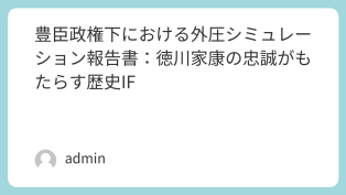 歴史 豊臣政権下における外圧シミュレーション報告書:徳川家康の忠誠がもたらす歴史IF 豊臣政権下における外圧シミュレーション報告書:徳川家康の忠誠がもたらす歴史IF序論:シミュレーションの前提と歴史的分岐点本報告書は、豊臣秀吉の死後、史実では瓦解した豊臣政権が、もし徳川家康の協調と忠誠によって安定政権として継続した場合、当時... 歴史
