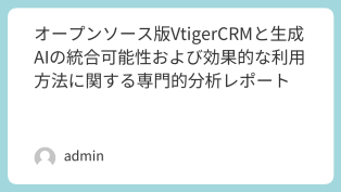 IT オープンソース版VtigerCRMと生成AIの統合可能性および効果的な利用方法に関する専門的分析レポート オープンソース版VtigerCRMと生成AIの統合可能性および効果的な利用方法に関する専門的分析レポートエグゼクティブ・サマリー本レポートは、ライセンス費用が不要で高い柔軟性を持つオープンソース版VtigerCRMが、ChatGPTやGem... IT