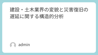 時事 建設・土木業界の変貌と災害復旧の遅延に関する構造的分析 建設・土木業界の変貌と災害復旧の遅延に関する構造的分析序論:日本の建設・土木業界と災害復旧の構造的課題近年、日本列島は能登半島地震(2024年)や熊本豪雨(2020年)に代表される大規模自然災害に頻繁に見舞われています。これらの災害は、地域... 時事