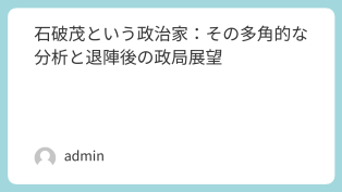 時事 石破茂という政治家:その多角的な分析と退陣後の政局展望 石破茂という政治家:その多角的な分析と退陣後の政局展望第1章:石破茂という政治家:その多角的な人物像1.1 政治家としての足跡:キャリアと実績の分析石破茂氏の政治家としてのキャリアは、単なる世襲政治家の枠を超えた多層的なものである。1957... 時事
