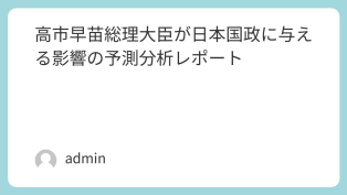 時事 高市早苗総理大臣が日本国政に与える影響の予測分析レポート 高市早苗総理大臣が日本国政に与える影響の予測分析レポートエグゼクティブ・サマリー高市早苗氏が首相に就任した場合、その政権運営は単なる現状維持ではなく、新しい形の日本型保守主義を明確に打ち出し、リスクを伴う実験となる可能性が高い。その政治的基... 時事