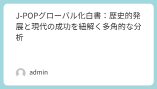 MUSIC J-POPグローバル化白書:歴史的発展と現代の成功を紐解く多角的な分析 J-POPグローバル化白書:歴史的発展と現代の成功を紐解く多角的な分析序章:J-POPグローバル化の複合的要因と歴史的文脈近年、J-POPが世界的な注目を集め、ストリーミングチャートやSNSを席巻する現象が顕著になっている。この隆盛は単なる... MUSIC